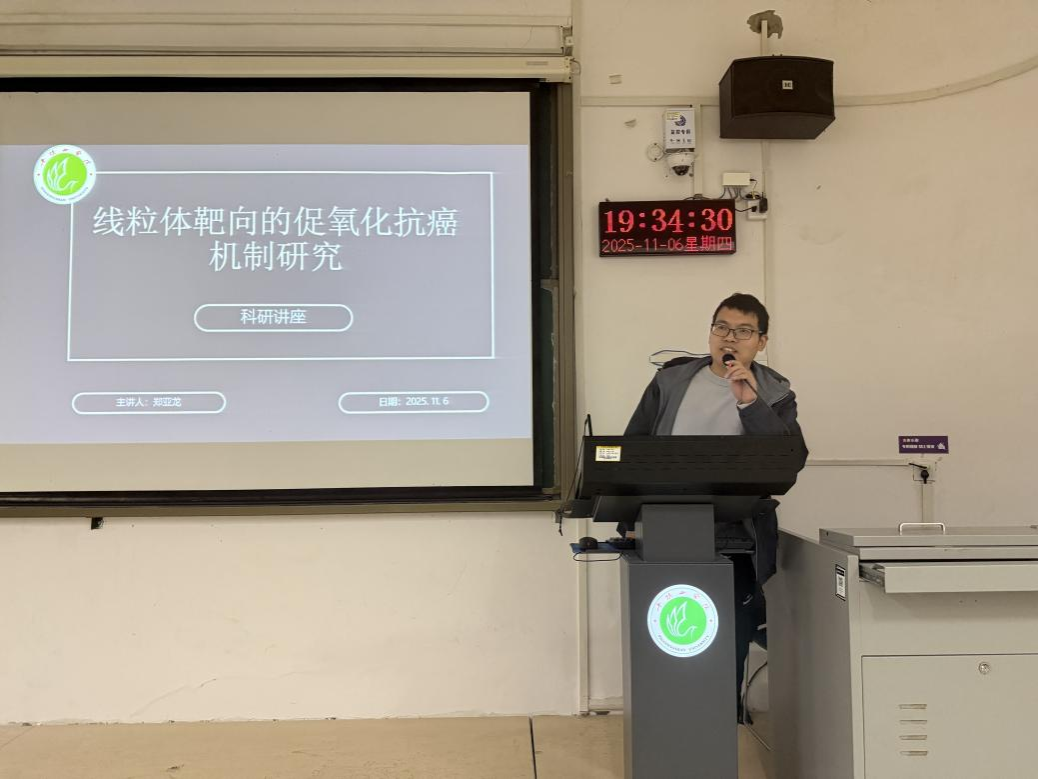郑亚龙博士为学生带来了一场题为“线粒体靶向的促氧化抗癌机制研究”的科研讲座。郑博士从全球癌症发病现状切入,介绍了以三苯基膦正离子为靶向基团、基于姜黄素设计的MitoCur-1分子。该化合物可选择性富集于肝癌细胞线粒体,高效诱导ROS生成,双重抑制氧化磷酸化与糖酵解,引发能量危机,从而有效抑制肿瘤生长。讲座结束后,郑博士结合考研与学科竞赛,鼓励同学们专注科研、勇于探索,在学术道路上不断进取。