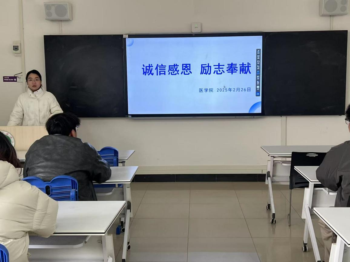 为引导学生树立诚信立身、感恩奉献、励志成才的观念,进一步增强学生的社会责任感和道德修养,医学院于2025年2月26日面向全体学生组织开展了“诚信感恩,励志奉献”主题宣讲活动。